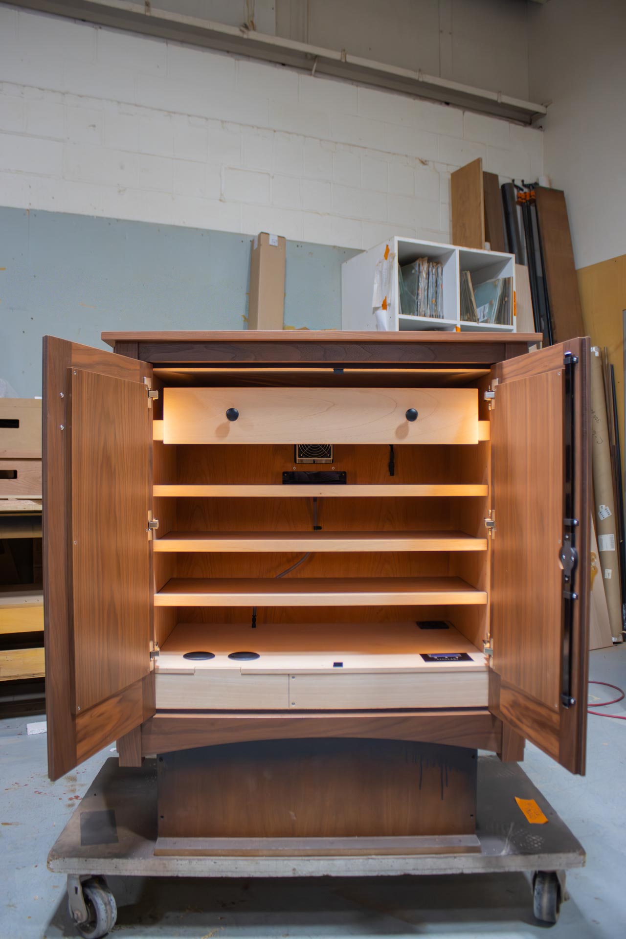 This custom humidor reimagines a familiar silhouette with thoughtful details that make it truly stand out. Equipped with temperature and humidity control, it delivers full oversight of the interior climate for consistent, effortless storage. Burled walnut panels paired with refined trim bring warmth and richness to the piece. A stunning realization of a client’s vision.