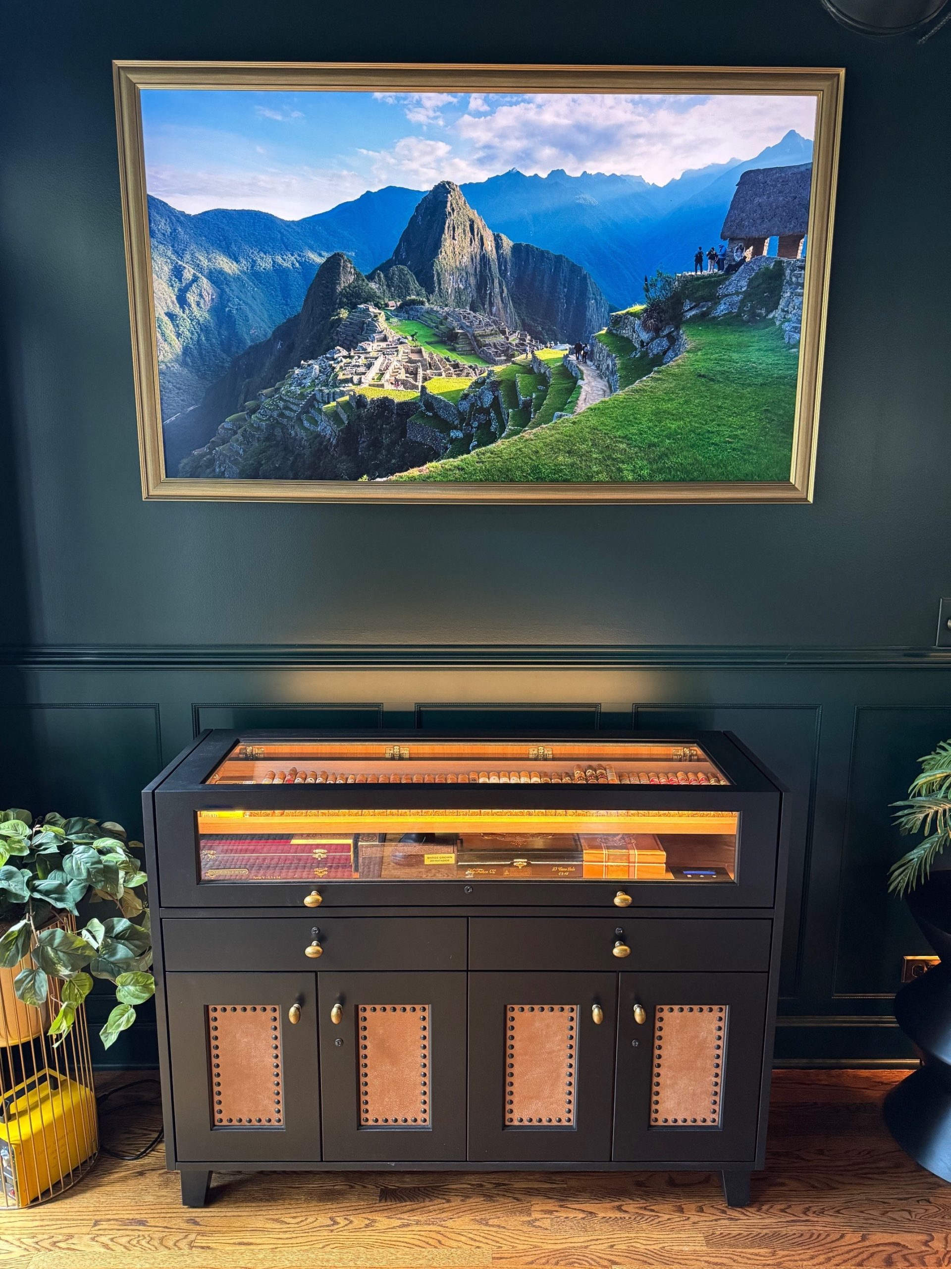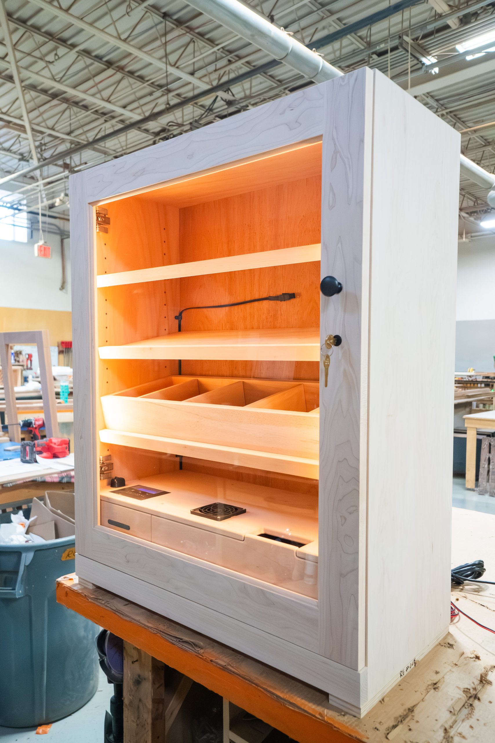 Designed based off previous custom credenza designs, we built this custom humidor for a client in New York. The cabinet features a “lift up” glass lid and leather panels, bordered with upholstery tacks, on the front lower drawers and side panels. Our Guardian 100 Digital Humidification System, housed behind the lower right-hand door, maintains the perfect environment for stored cigars. This humidor includes a variety of cigar storage options within with adjustable shelves and drawers with dividers for loose cigars.